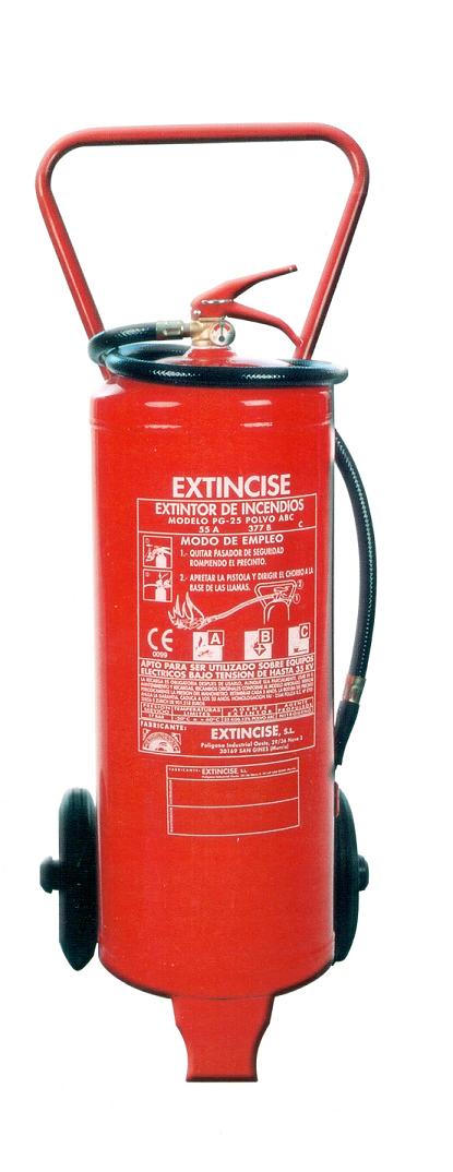 Extintor de Polvo Químico ABC de 25KG sobre ruedas. Incluye manómetro, válvula de disparo rápido, manguera, chasis tubular soldado al extintor con ruedas y manguera. Pintado en rojo RAL-3000. Fabricado según EN-3/96. Temperatura utilización: -20ºC/+60ºC.