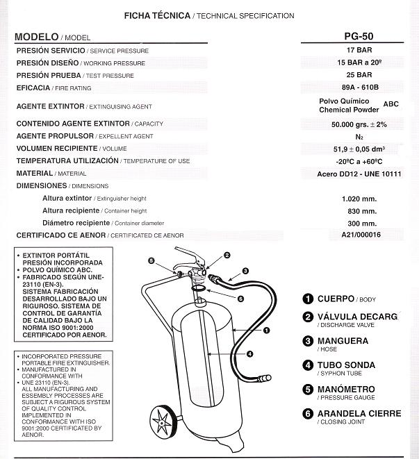 Extintor de Polvo Químico ABC de 50 KG sobre ruedas. Incluye válvula de disparo rápido, manómetro, manguera y chasis tubular soldado al extintor con ruedas. Fabricado según EN-3/96. Equipo pintado en rojo RAL-3000. Temperatura utilización: -20ºC/+60ºC.